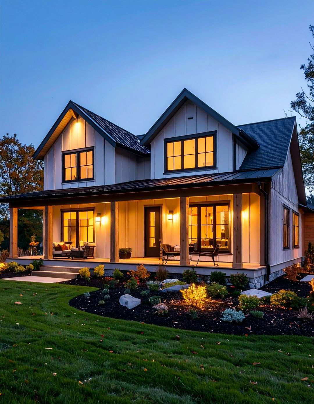 In contrast to previous design trends, swapping to deep-black frames on vertical board-and-batten siding can create a striking visual effect that elevates the design of a house exterior. The dark mullions not only emphasize proportion and rhythm but also effectively mask grime between cleanings. For the siding, consider using composite or engineered wood boards factory-coated in a weatherproof finish; their subtle texture plays nicely with the smooth metal frames. To add a touch of warmth and intentionality to the design, finish corners with cedar trim stained to match the porch beams. At dusk, uplighting a few battens can create a dramatic nighttime effect that further enhances the visual appeal of the exterior.
