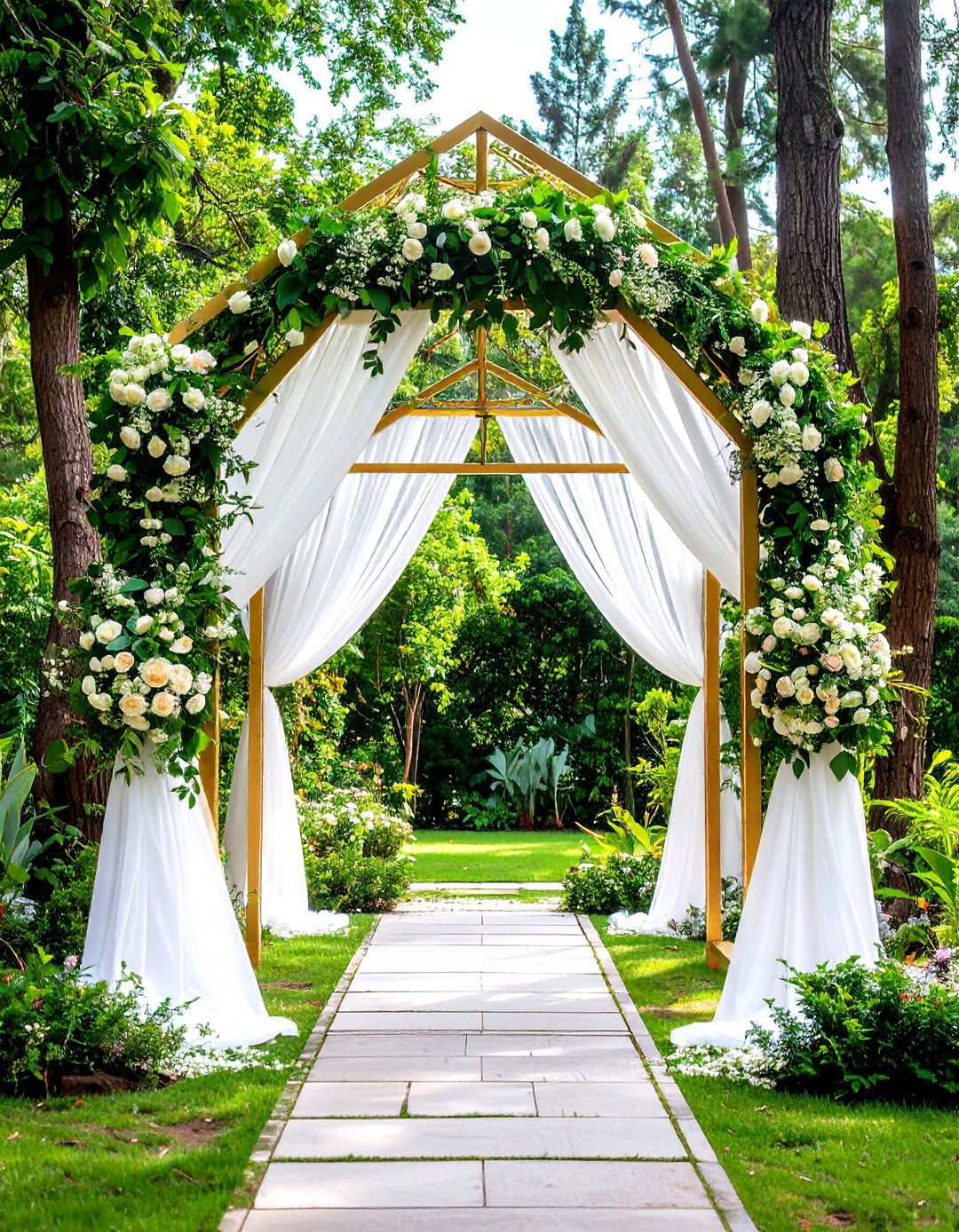 2. Gold-Leafed Geometric Structures Elevate the Ceremony Space