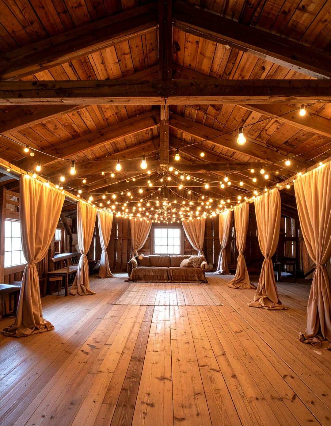 Elevate the ambiance of your barn wedding by incorporating show-stopping chandelier installations that command attention and set the tone for sophisticated elegance . Whether you opt for crystal chandeliers to exude refined luxury or rustic wooden fixtures to infuse a touch of countryside charm, these statement pieces transform barn ceilings into stunning architectural focal points. Strategically place chandeliers above key areas such as the dance floor, ceremony altar, or dining tables to create visually appealing contrasts between refined lighting and rustic barn structures. These dramatic installations not only add visual interest but also photograph beautifully, capturing the essence of your special day. To create a curated, collected-over-time appearance, consider mixing chandelier styles and sizes . Professional installation ensures safety and proper electrical connections, while combining chandeliers with other lighting elements like string lights or lanterns adds depth and sophistication to your barn wedding venue.