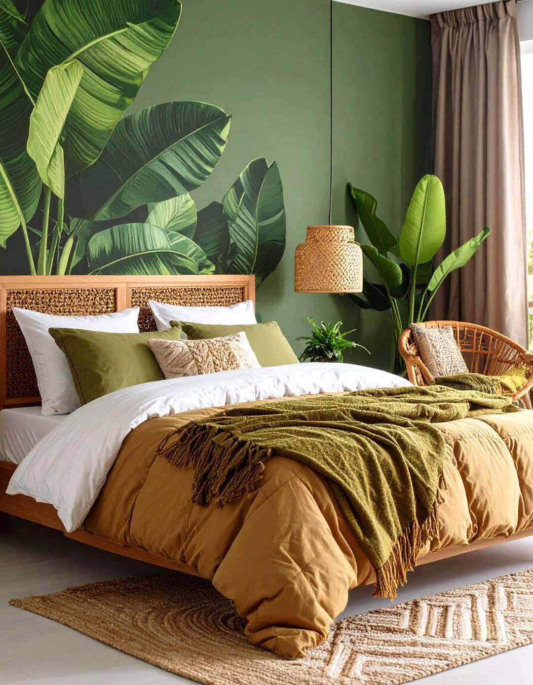 In the pursuit of creating a bedroom paradise, why settle for plain walls when you can transport yourself to a lush micro-jungle? Botanical wallpaper is set to be a defining trend in 2025, marrying vibrant patterns with heritage motifs for a fresh maximalist look. To avoid overwhelming the senses, choose one statement wall behind the bed and echo a single leaf color – olive, teal, or blush – in throw pillows and lightweight quilts. Balance the boldness of the pattern with breathable accents like rattan or cane furniture for a sense of ease. A botanical backdrop is the perfect way to bring vacation vibes into your daily routine, sans the daily watering worries.