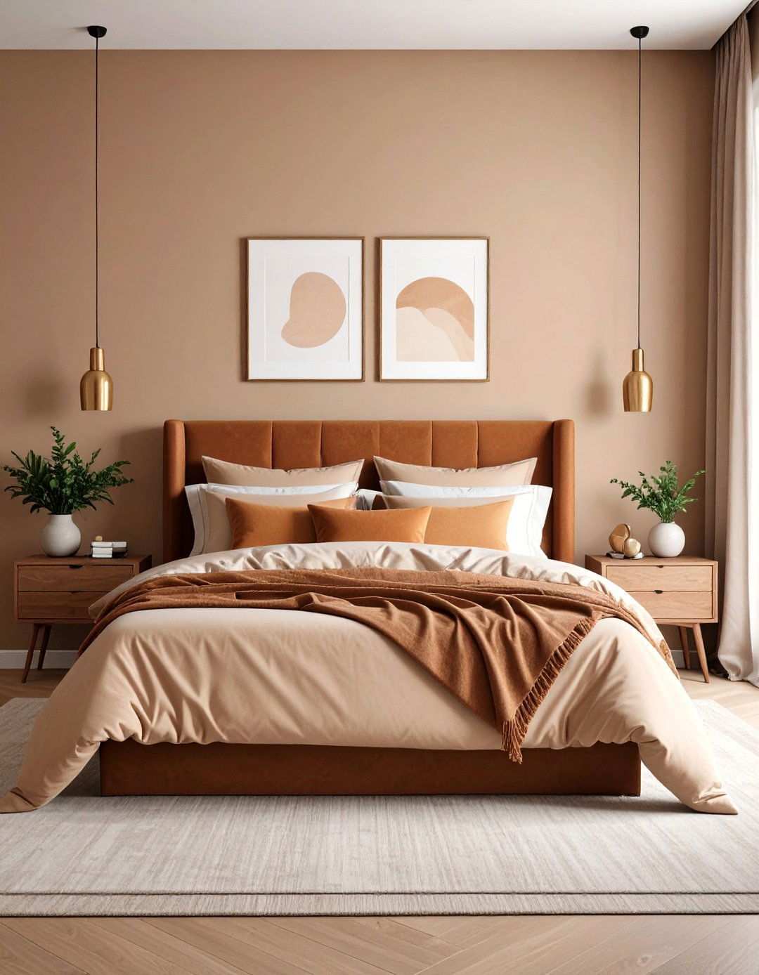 A single, deeper beige accent wall behind the headboard can instantly elevate the room’s drama and create a sense of architectural interest. This muted yet rich tone grounds the space, particularly in open-plan layouts, while still maintaining the calming essence of neutrals. Pair the deeper beige with mid-tone wood nightstands to achieve a harmonious contrast that feels intentional rather than jarring. For added depth, consider using satin paint, which reflects evening lamplight and adds a touch of sophistication that evolves throughout the day. To allow the wall color to take center stage, keep artwork minimal and let the space feel like a serene gallery.
