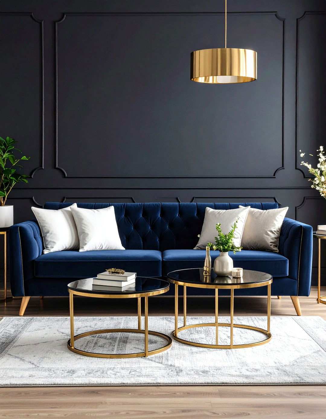 In studio apartments, painting one wall – typically behind the sofa – navy can help define the living room area. By introducing slim, black, multifunctional furniture, such as a coffee table with hidden storage or nesting side tables, the space can feel more organized and functional. A light, patterned rug and clear acrylic accents maintain airiness, while limiting dark colours to one vertical surface and portable pieces keeps the palette impactful without feeling enclosed. Small-space specialists advise using this strategy to create a sense of flow and visual interest in compact living areas.