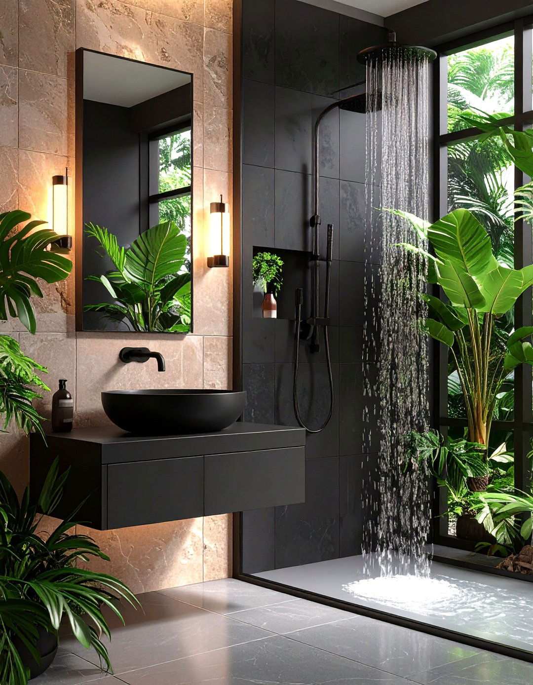 Houseplants like Boston fern or pothos add a pop of color and a touch of organic charm when placed against ebony tile. The lush foliage practically glows against the dark background, introducing a sense of life and mild humidity regulation. Hang trailing varieties beside the mirror or cluster a sculptural fiddle-leaf fig near the tub to soften the harsh lines of the space. Choose white or terracotta pots for a crisp, clean definition, and ensure that drainage saucers protect porous stone floors from water damage. The organic shapes of the plants create a beautiful counterbalance to the sharp lines of the space.
