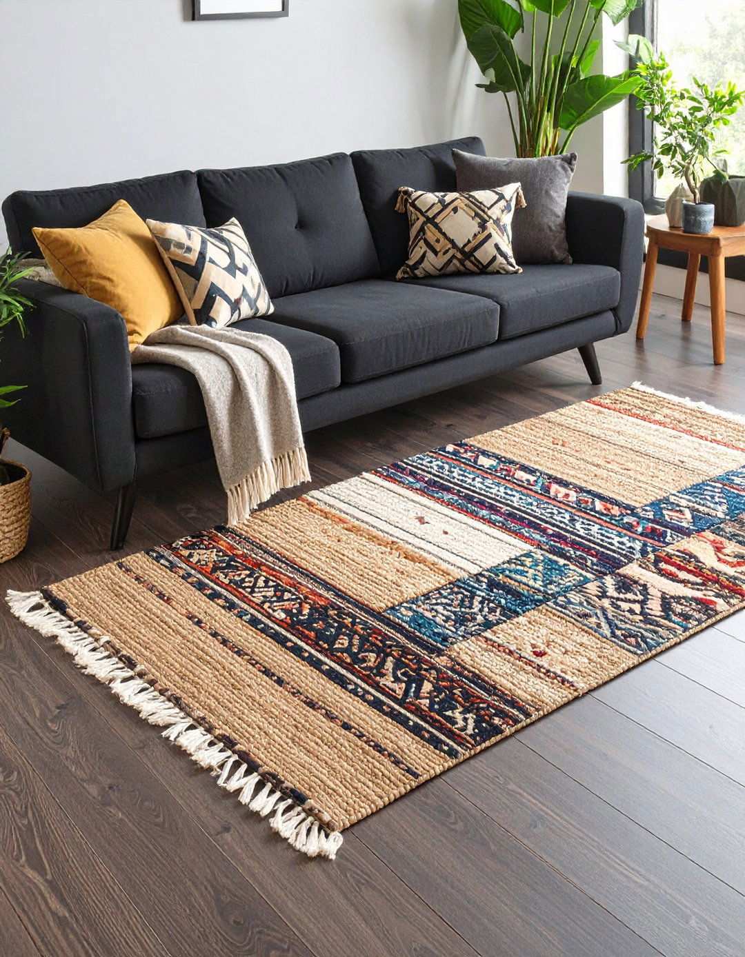 Lay a large jute area rug first, then angle a smaller Persian or Turkish rug on top for color hits and cultural flair. The neutral base handles foot traffic, while the vintage piece becomes the jewel of the room. Look for fringe or faded reds and pinks; they sing against black yet reference the earthy palette that defines bohemian style.