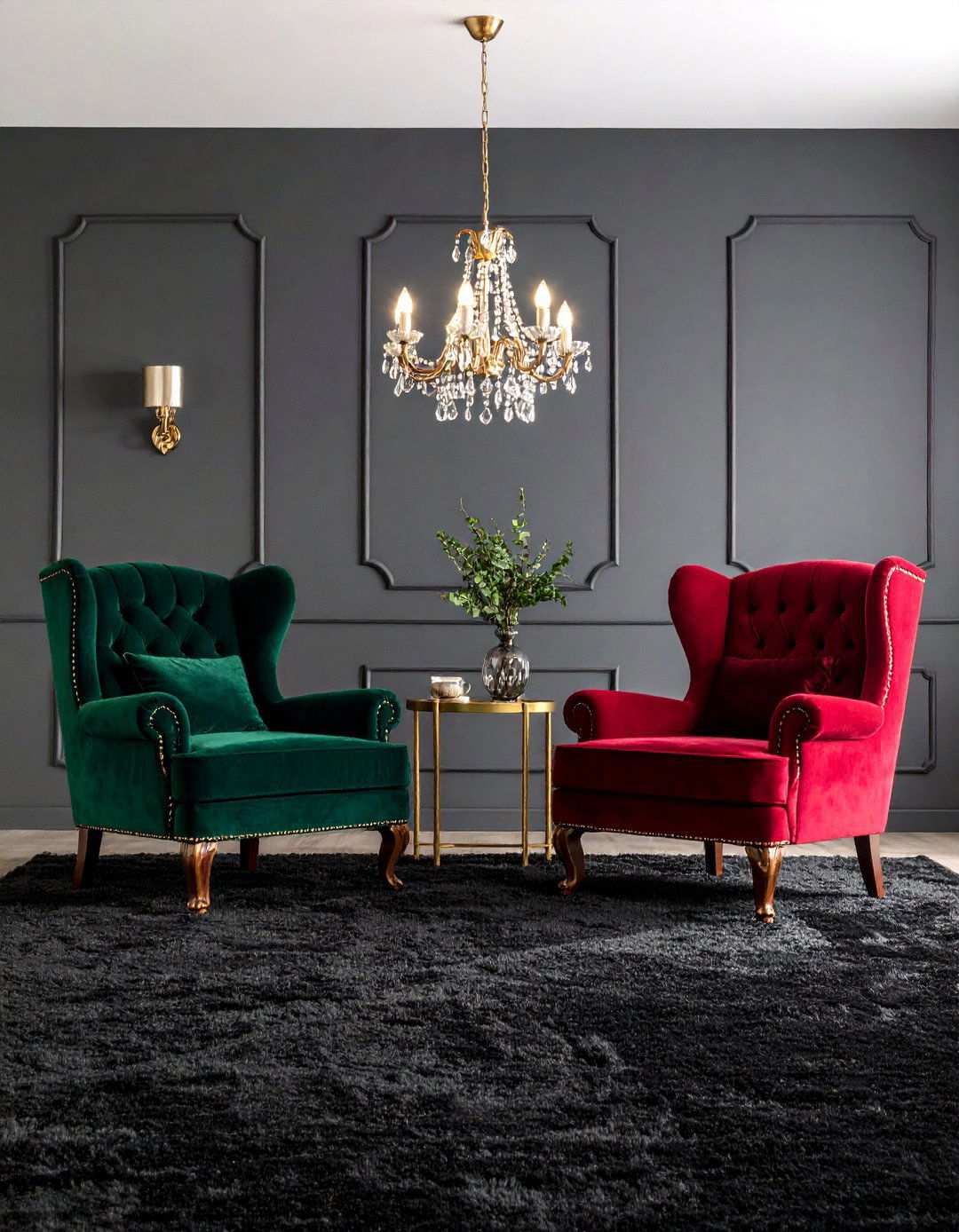A black carpet is the perfect canvas for rich jewel colors, which can add instant drama to your living room without feeling overdone. Consider scattering velvet cushions or a statement armchair in emerald, sapphire, or ruby hues – their saturated pigments will glow against the dark base. To prevent heaviness, balance with a few matte brass or gold details that pick up light and add warmth. Keeping walls a gentle gray will ensure that the gemstone shades stay the heroes while still tying back to the floor. A dimmable chandelier lets you dial mood lighting from glamorous evening lounge to bright weekend reading nook, creating a living room that feels like a luxurious theater set. The best part? No renovation required – just a few smart design choices.
