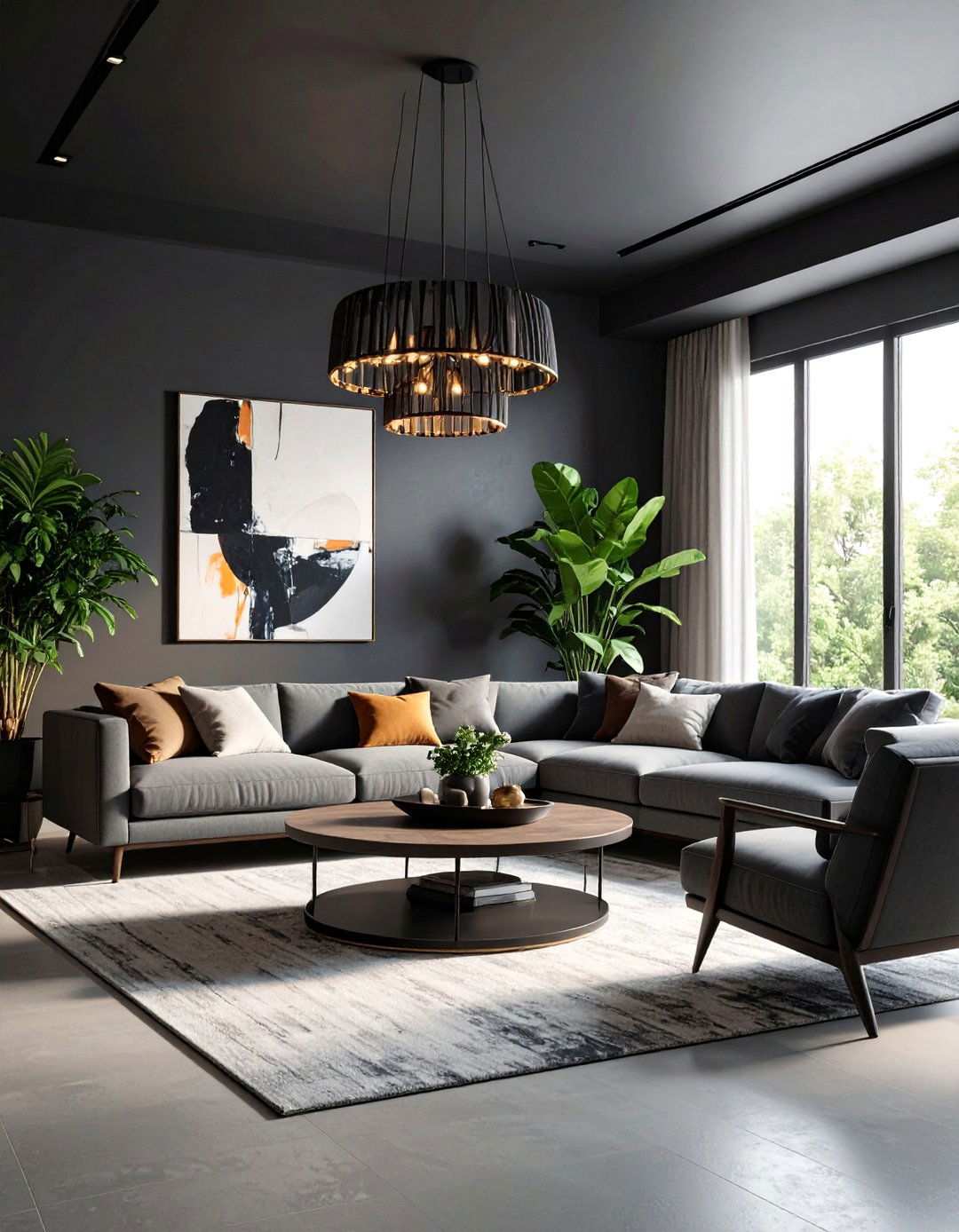 In contrast to what many might expect, the black overhead ceiling actually makes modern chandeliers appear as if they’re floating in mid-air, casting dramatic shadows onto the grey walls. To heighten this effect, select fixtures with open frameworks, allowing negative space to play a significant role in reinforcing the airy-yet-moody atmosphere.
