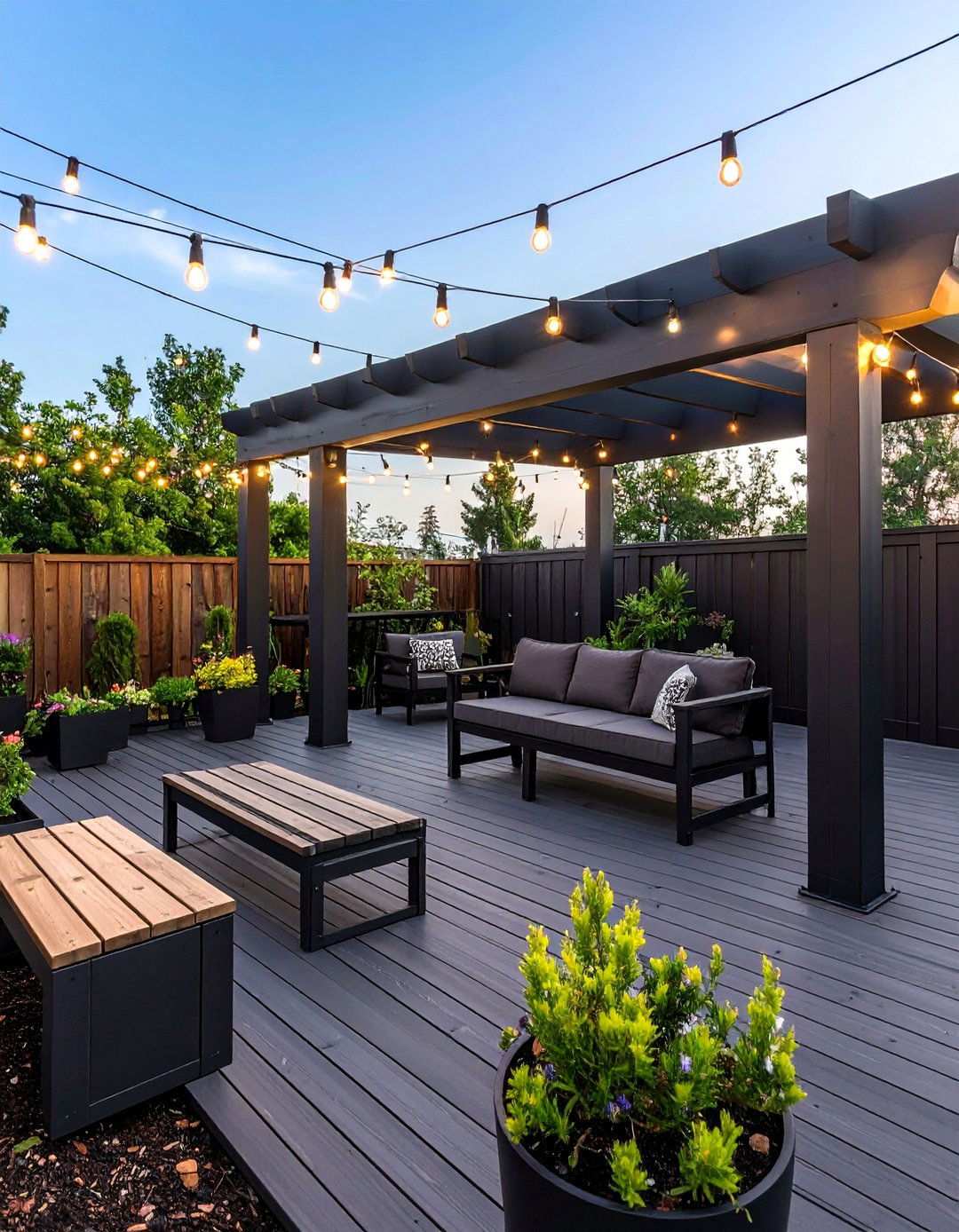 A powder-coated pergola above your Black Deck amplifies architectural drama while controlling glare. Rafters spaced a foot apart filter sunlight, allowing twilight string lights to sparkle above. Concealed wiring inside hollow beams powers dimmable café bulbs and misting fans, significantly cooling the surface and transforming the space into an open-air dining area after dark.