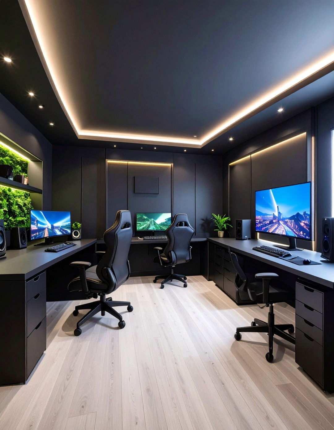 Strategically placed white peripherals, monitor bezels, or framed art can inject a refreshing splash of contrast into the room, preventing it from feeling cave-like. One approach is to incorporate a light-colored desktop surface that reflects LED glow upward, reducing the need for overhead lighting. To achieve the perfect balance, keep white accents under 20% of the visual field, ensuring the black color scheme remains the dominant force.