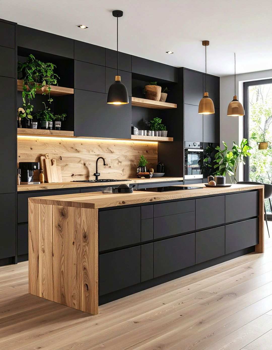 Staggering color—dark bases with lighter uppers—is a 2025 trend that injects instant movement into kitchen walls. By letting lower black kitchen cabinets anchor the room, you can create a grounded composition that suits both soaring lofts and modest apartments. Introduce pale gray, cream, or fluted wood wall units to lift sightlines and add visual interest. To tie the palette together, consider a mixed-material island featuring black on the cook-side and bleached oak toward the breakfast stools. If you’re hesitant, start by painting just one tall pantry door; living with the change will make the leap to full two-tone glory easier to take.