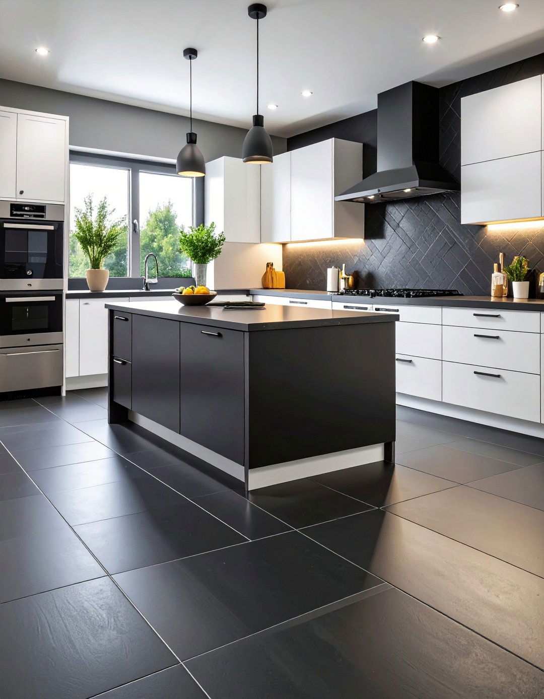 Charcoal slate offers a black kitchen floor that masterfully balances farmhouse charm with modern appeal, thanks to its unique finely cleft texture. Designers praise the slate’s soft color variation, which ranges from ink to graphite and smoky blue, effectively disguising crumbs and adding organic movement to even the most minimalist cabinetry. When paired with limewashed walls or butcher-block counters, the slate’s earthy matte surface appears hand-hewn, yet it also accepts honed finishes for a smoother sweep. To maintain the slate’s integrity, it’s essential to seal the surface annually to resist oil splatters and mop with stone-safe soap; the dense material can shrug off dropped cast-iron pans with ease. For added warmth, consider installing radiant heat coils below the slate, amplifying its natural conductivity and keeping toes warm on winter mornings.