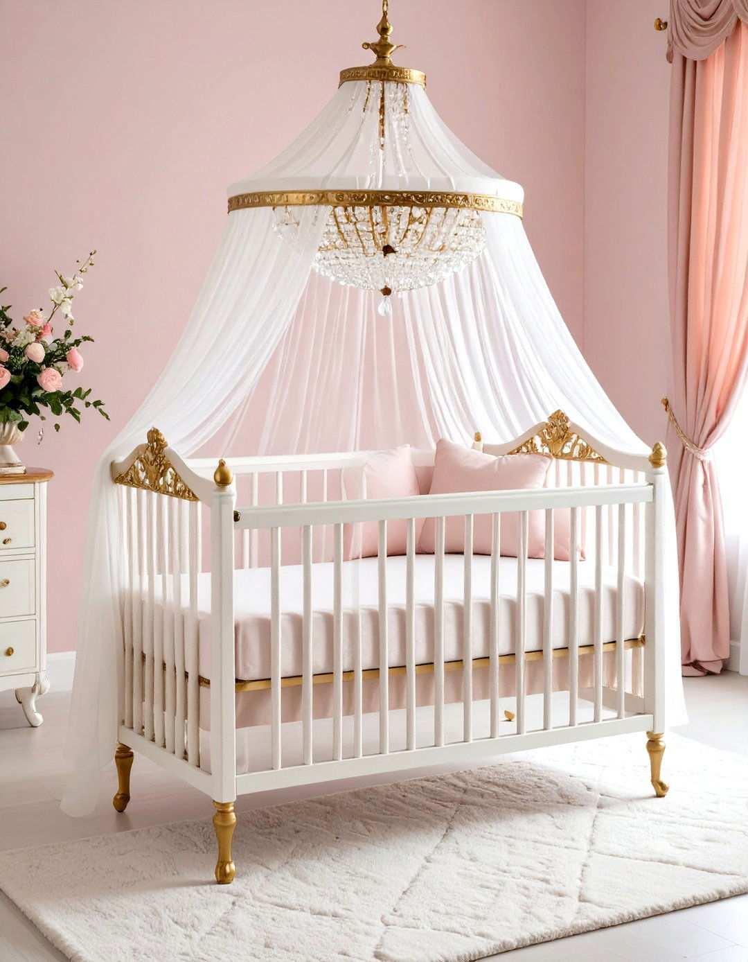 Recreate a whimsical haven for your little princess with opulent, lavish elements that transport her to a majestic kingdom. Begin with a statement piece, such as a lavish crib, which becomes the room’s central focal point, and then incorporate majestic elements like an exquisite chandelier or sophisticated pendant lighting. Mix and match soft pastel hues or rich jewel tones to reflect your royal vision, and don’t forget crucial accessories like crowns, intricately framed mirrors, and plush seating fit for a queen. Consider adding an ethereal canopy above the crib using flowing tulle or silk fabrics. Storage solutions can feature a grand armoire for tiny royal dresses and a treasure chest adorned with decorative details for storing precious keepsakes. Layer in sumptuous textures through plush area rugs, sumptuous throw pillows, and window treatments that evoke the magic of a fairy tale in your baby girl sanctuary.