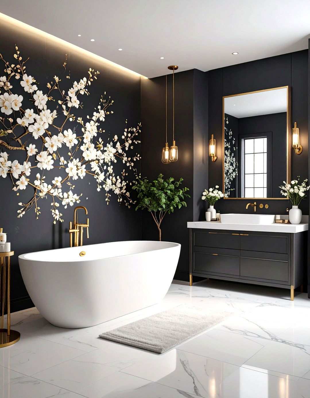 Achieve a beautiful balance between the drama of black and the organic beauty of natural stone by incorporating stone elements into your design. Zellige tile paired with black walls and ceilings accented with brass creates an intimate, dramatic space that invites relaxation. To replicate this look, choose natural stones like slate, granite, or textured ceramic tiles that complement black walls. Consider adding river rock mosaics, stacked stone accents, or honed marble surfaces to create a sense of tactile interest. The irregular patterns and natural variations in stone provide a striking contrast to the smooth black surfaces. By incorporating stone vessel sinks or natural stone flooring, you can create a grounding element that prevents the space from feeling cold. Warm-toned stones also add a spa-like tranquility that pairs perfectly with the dramatic elegance of black.