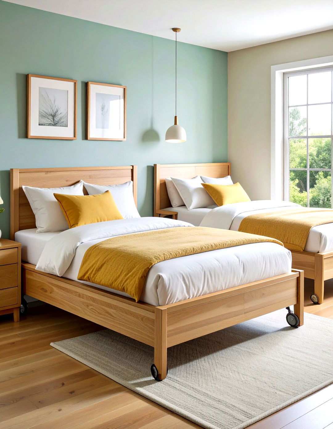 In small rooms, beds can be strategically positioned to create dynamic, functional spaces that make the most of available floor area. By placing one bed along the longest wall and orienting the second bed at a 90-degree angle, a visually engaging arrangement is forged that defines separate sleeping zones. This configuration is particularly well-suited to rectangular bedrooms where traditional parallel arrangements might otherwise feel constrained. The resulting layout allows for creative placement of additional furniture, such as a desk, reading chair, or storage unit, while also providing an organic separation between sleeping areas, making it an ideal choice for siblings sharing a room or guest accommodations.