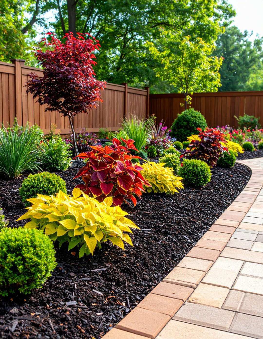 A vibrant first impression is often formed at the curb, and a neatly framed border of precast bricks with inky black mulch creates an instant, sophisticated outline for shrubs and annuals. The dark ground layer has the added benefit of absorbing glare, allowing bright coleus, dwarf boxwoods, or seasonal bulbs to appear almost spotlighted against it. For optimal results, lay bricks flush to grade so the mower wheel rides the edge, eliminating the need for tedious string-trimming. To maintain a weed-suppressing depth without suffocating roots, keep the mulch at two to three inches throughout the season. A light top-dress each spring will ensure the bed retains its sharp, graphic definition long after neighboring yards fade into mid-summer chaos.