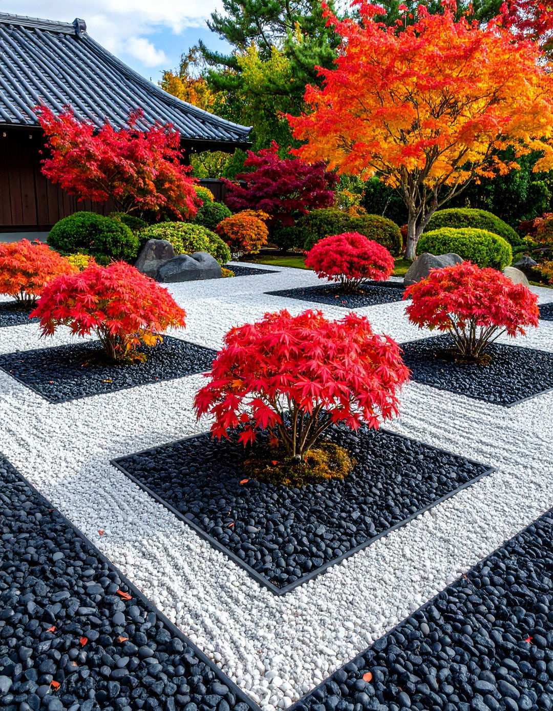 In contrast to a single-texture bed, alternating stripes or checkerboards of river gravel and black mulch create a dynamic and modern “living art” floor that complements sleek hardscapes and contemporary architecture. The mulch provides fertile rooting zones for architectural plants, such as upright dwarf Japanese maples, while the gravel captures roof runoff and reduces splashing on siding. For optimal results, keep planting pockets generous and install a hidden steel edging strip to prevent materials from drifting. To maximize tonal contrast, choose cool-gray stones, then echo that palette in patio furniture or planters to tie the whole vignette together.