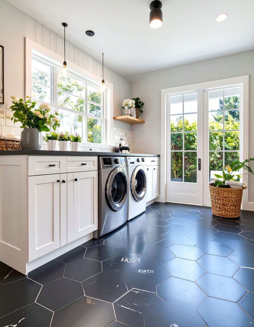 When it comes to choosing a black floor tile, you’re spoiled for choice, with a range of options available, including porcelain, ceramic, slate, and concrete materials. Each of these choices offers a unique texture and visual appeal, making it easy to find the perfect fit for your laundry room. Manmade materials like porcelain and ceramic are particularly well-suited to high-traffic areas, where years of heavy use are the norm. Consider black penny tile, large format tiles, or geometric patterns to create a distinctive look that sets your space apart.