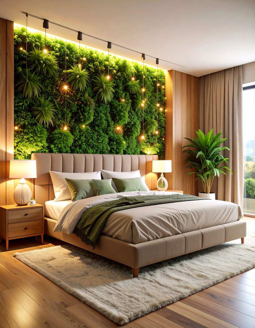 Create a tranquil retreat in your bedroom with an artificial grass wall headboard that captures the essence of a countryside hideaway. Install artificial grass panels along the wall behind your bed, crafting a cozy sanctuary reminiscent of a serene countryside escape. This design brings warmth and organic texture to your sleeping area, serving as an eye-catching focal point that invites relaxation. To further elevate the ambiance, combine artificial grass with wooden panels, a tufted design, or even soft, twinkling fairy lights. The lush green backdrop creates a soothing atmosphere, perfect for unwinding after a long day. Pair with neutral bedding and warm, inviting lighting to complete the serene, nature-inspired retreat that transforms your bedroom into a peaceful sanctuary.