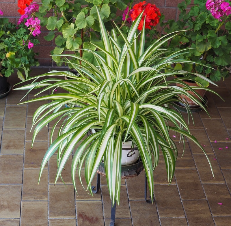It is also known as Variegated Spider Plant. The species has white striped and slightly curved leaves marked with medium green colors. It is an excellent option for a hanging basket.
