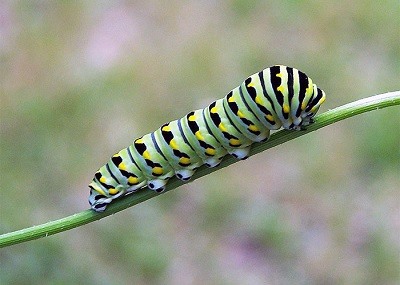 These caterpillar species have lime-green bodies with striking black stripes. Juvenile black swallowtail caterpillars have black bodies that resemble bird droppings. A mature swallowtail caterpillar turns into a pupa and later a beautiful black swallowtail butterfly.