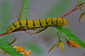 The stunning fat green caterpillar turns into a tan-colored moth. It grows to about 1.5cm long before entering the pupa stage. The yellow bands, white, and black markings on the greenish-white body are the prominent features.