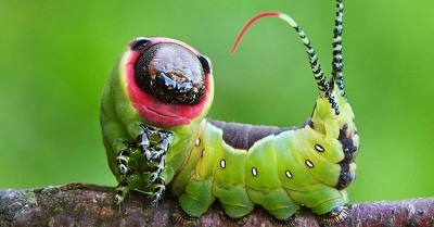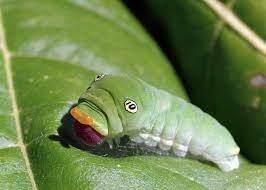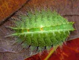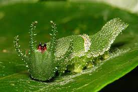 It is a fat-green caterpillar with a triangular head at one end and a long spiky tail at the other. It can extend menacing lashes to ward off insects when feeling threatened. The patterns on the head are scary to scare potential predators.