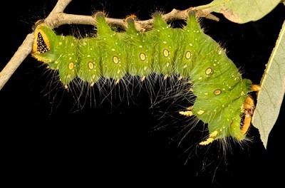 It is among the largest green caterpillar species with a spiky pale green body. It also has some segments forming ridges on the smooth body. The luna moth caterpillars have orange or yellow spots with sprouting small fine black spines.