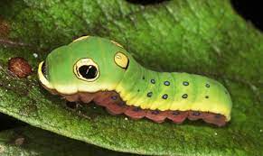 These plump body caterpillars can grow up to 10cm long with pale green colors and brown undersides. The false eyespots help scare away potential predators when feeling threatened.
