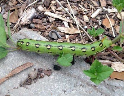 The horns make these caterpillar species look scary but are ideal as a defense mechanism from predators. The black spots rows with yellow centers are prominent features for identifying white-lined sphinx moth caterpillars.