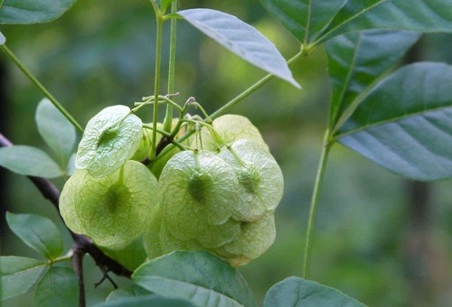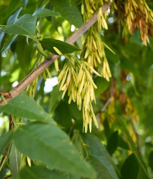 It also generates small greenish-white flowers with four petals in spring and summer. These flowers develop into samara fruits and later produce helicopter seeds after ripening. The tree species are tolerant to drought, poor soil, and shade.