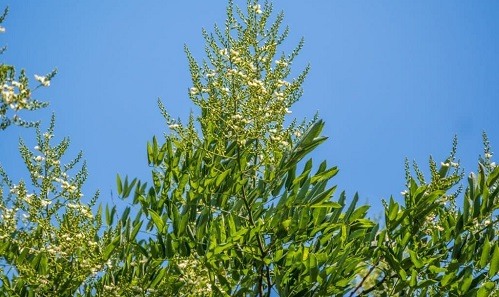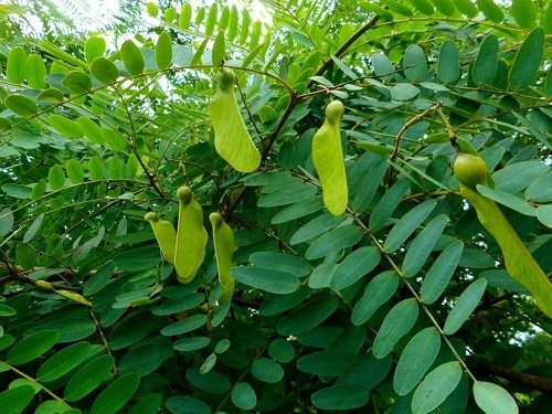 These are fast-growing trees that can reach 50ft within a few years. They have large compound leaves with about 40 leaflets on each leaf. The tree also produces a cluster of small greenish white flowers at the end of its branches.