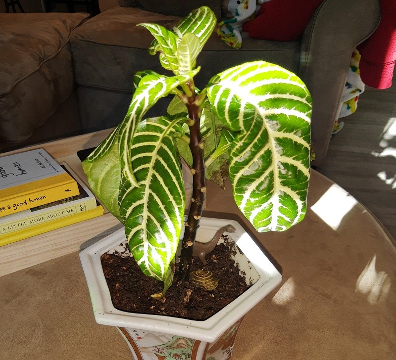 The tropical plant prefers eight hours of bright indirect sunlight. Low light conditions will make the houseplant lose the zebra-like patterns.